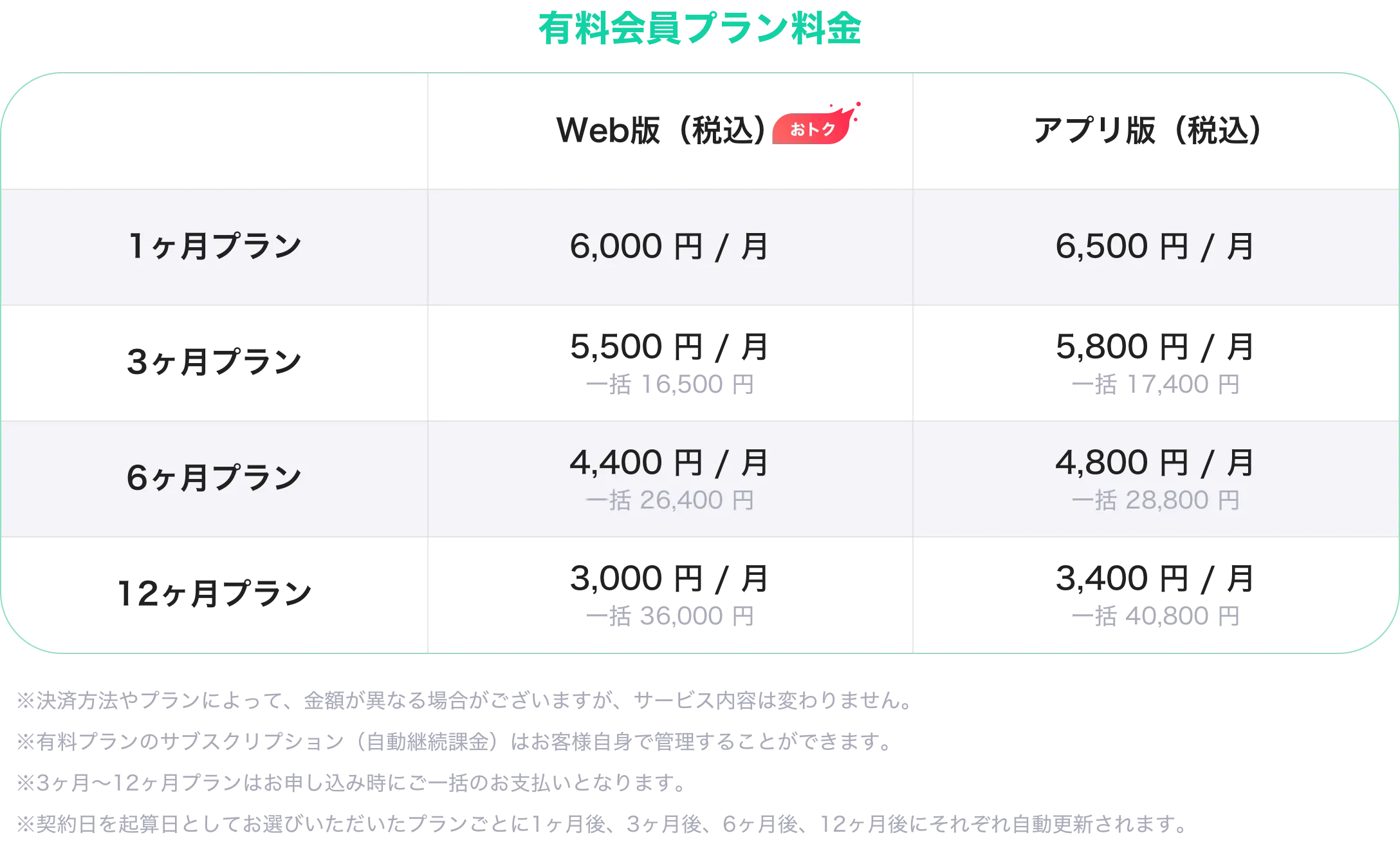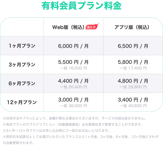 更新時期は、購入手続完了日を1日目とし、30日目(1ヶ月プラン)・92日目(3ヶ月プラン)・185日目(6ヶ月プラン)・365日目(12ヶ月プラン)に自動更新され、料金も引き落とされます。